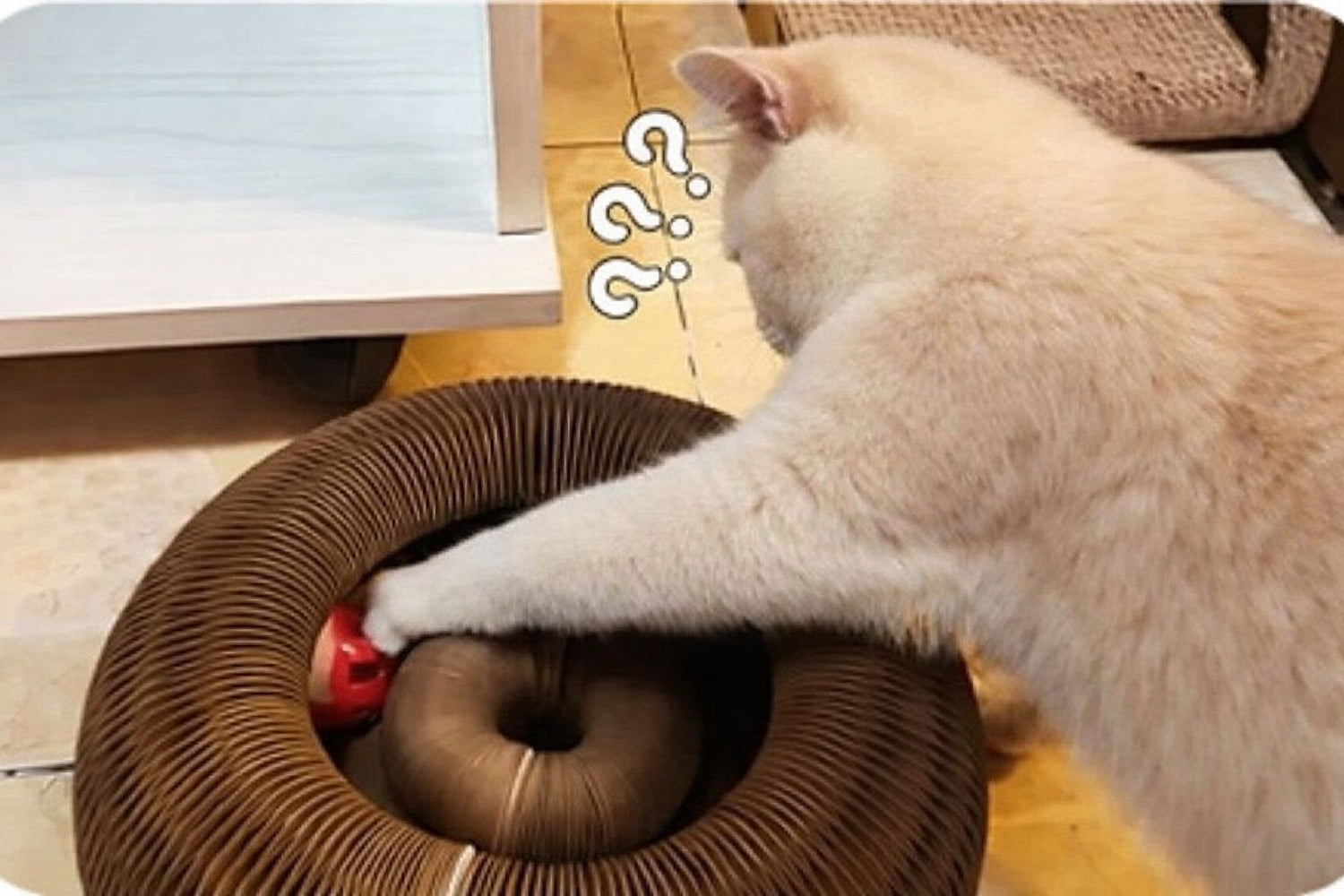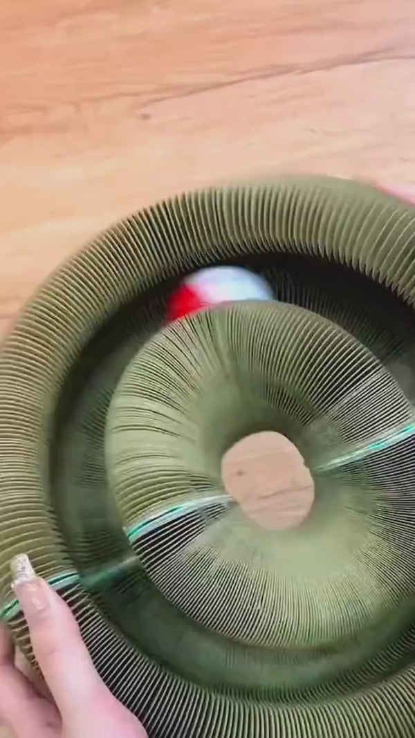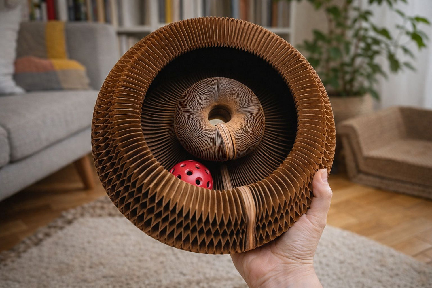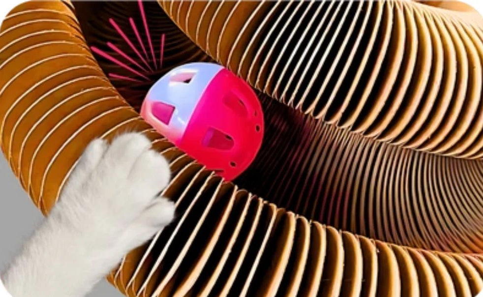 Le Tourbillon Félin™ est fabriqué en carton ondulé renforcé à double épaisseur, spécialement conçu pour résister aux griffades, aux sauts et aux jeux intenses.Même les chats les plus dynamiques peuvent grimper, griffer ou le faire rouler sans l’endommager. Sa structure flexible absorbe les chocs tout en conservant sa forme.